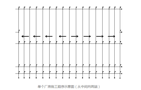 鋼結(jié)構(gòu)吊裝采用“先中間、后外側(cè),先柱后梁,先下后上”的原則。在廠房的中間部位最先形成一穩(wěn)定得框架體系,然后向兩端進(jìn)行推進(jìn)、對(duì)稱安裝其余的鋼柱、鋼梁構(gòu)件。順序如下圖所示: