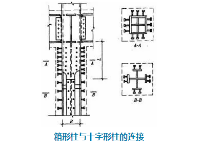 高層鋼結(jié)構(gòu)中的箱形柱與下部型鋼混凝土中的十字形柱相連時(shí),應(yīng)考慮截面形式變化處力的傳遞平順。箱形柱的一部分力應(yīng)通過栓釘傳遞給混凝土,另一部分力傳遞給下面的十字形柱,如下圖所示。兩種截面的連接處,十字形柱的腹板應(yīng)伸入箱形柱內(nèi),形成兩種截面的過渡段。伸入長度應(yīng)不小于柱寬加200mm,即L≥B+200mm,過渡段截面呈田字形。過渡段在主梁下并靠緊主梁。