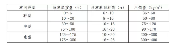 廠房按單位面積計(jì)算的用鋼量,是評(píng)定設(shè)計(jì)的經(jīng)濟(jì)合理性的一項(xiàng)重要指標(biāo)。各類廠房單位面積用鋼量的統(tǒng)計(jì)數(shù)值見(jiàn)下表