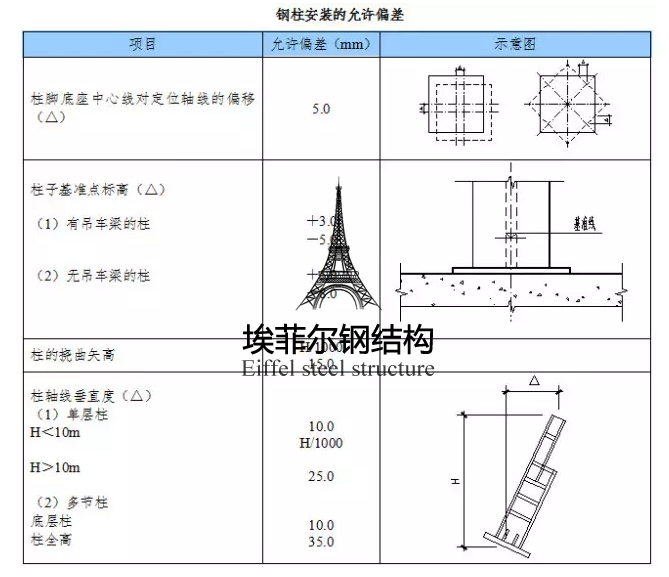 3). 柱子安裝的允許偏差應(yīng)符合下表規(guī)定。吊車梁、屋架安裝和吊車梁調(diào)整、固定連接后,柱子尚應(yīng)進(jìn)行復(fù)測(cè),超過(guò)允許偏差的應(yīng)進(jìn)行調(diào)整。