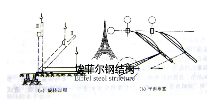 1). 旋轉(zhuǎn)法:鋼柱運(yùn)到現(xiàn)場(chǎng),起重機(jī)邊起鉤邊回轉(zhuǎn)使柱子繞柱腳旋轉(zhuǎn)而將鋼柱吊起。