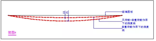 大家可以想到,風(fēng)荷載屬于可變荷載,在風(fēng)壓消失的時(shí)候,它對(duì)玻璃的荷載消失,所產(chǎn)生的變形相應(yīng)消失,而玻璃的自重屬于永久荷載,它對(duì)玻璃產(chǎn)生的變形卻不會(huì)消失,那么它的變形就會(huì)如圖所示的那樣,在玻璃中部會(huì)有凹陷,形成一個(gè)天然的水坑或者說(shuō)是垃圾坑,那么造成積水積灰就成必然了。