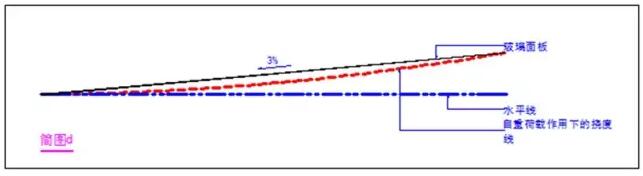 那么我們把坡度調(diào)整為2%呢,請(qǐng)大家看“簡(jiǎn)圖c”,此時(shí),水坑的底部基本與水平線相切,相對(duì)于水平面的凹陷現(xiàn)象基本消失,但是筆者卻也同時(shí)發(fā)現(xiàn),在實(shí)際中,按此方法設(shè)計(jì)的雨棚,還是會(huì)有少量的積水積灰現(xiàn)象的發(fā)生,這種現(xiàn)象筆者初步分析為施工上的少許誤差或支撐桿件所受永久荷載的變形所造成,那么我們就還有必要通過(guò)技術(shù)手段來(lái)解決此問(wèn)題。