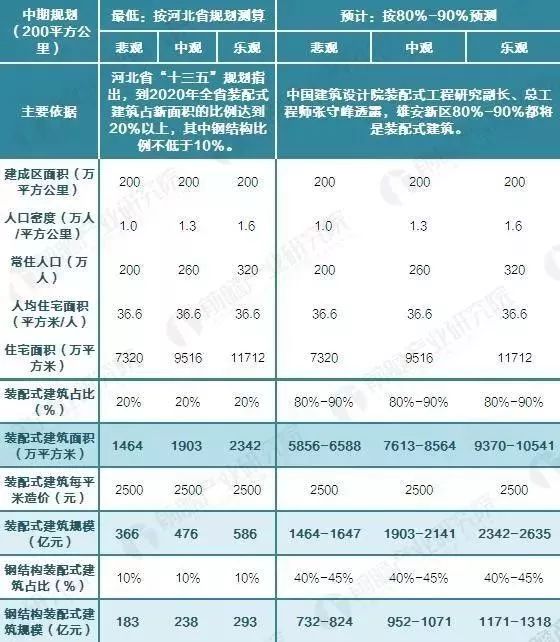同樣按照最悲觀的人口密度1.0萬人/平方千米、人均住宅面積36.6平方米/人、20%的裝配式建筑比例、10%的鋼結構裝配式比例測算,雄安新區(qū)裝配式建筑的投資規(guī)模為1647億元,鋼結構投資規(guī)模824億元;按照最樂觀的預計,雄安新區(qū)裝配式建筑和鋼結構裝配式建設的規(guī)模分別為1.05-1.19萬億、5270億-5929億。