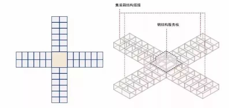 內部為鋼結構服務核,四周為箱式模塊結構功能體