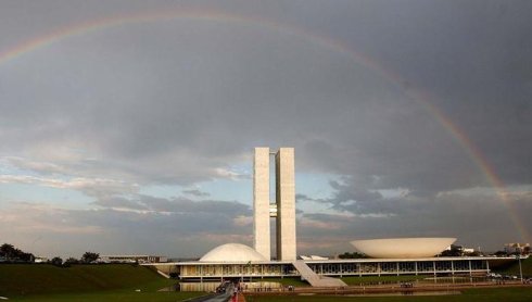 巴西議會大廈矗立于巴西首都巴西利亞市的核心三權(quán)廣場上,是由巴西建筑師奧斯卡·尼邁耶(Oscar Niemeyer)設(shè)計,整幢大廈分為參議院、眾議院會議大廳和辦公樓3部分,由縱橫兩條軸線組成,水平、垂直的體形對比強烈。參議院、眾議院會議大廳的外形均是半球體,一仰一覆放置,猶如兩只巨大的“碗”;而中間的辦公大樓則是由兩座細(xì)長的高樓連接而成,猶如一雙“筷子”,整座建筑相互協(xié)調(diào),巧妙地組合在一起,看上去就像一組“組合餐具”,引人入勝。