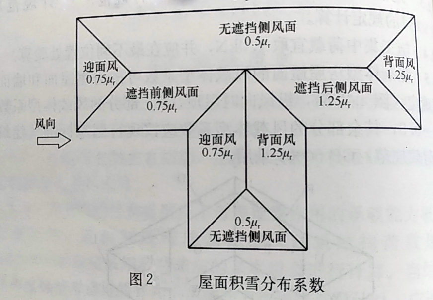 ƒ對側風面屋面:在屋面無遮擋情況時,側風面屋面積雪分布系數(shù)取0.5µr;在屋面有遮擋情況時,遮擋前側風面積雪分布系數(shù)取0.75µr;遮擋后側風面屋面積雪分布系數(shù)取1.25µr。