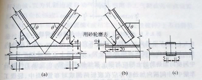 2、桿件的填板當(dāng)用焊縫連接時(shí),焊縫起落弧點(diǎn)應(yīng)縮進(jìn)至少5mm(圖1c),重級(jí)工作制吊車桁架桿件的填板應(yīng)采用高強(qiáng)度螺栓連接。