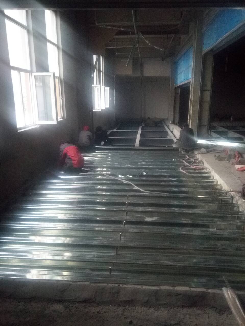 查看詳情1、施工工藝 樓承板的工藝流程大體是這樣的:彈線(xiàn)排版下料吊運(yùn)壓型鋼板安裝堵頭板和封邊板安裝焊接固定驗(yàn)收布筋埋件澆筑養(yǎng)護(hù)。 2、主要分項(xiàng)施工方法 1、彈線(xiàn)先在鋪板區(qū)彈出鋼梁